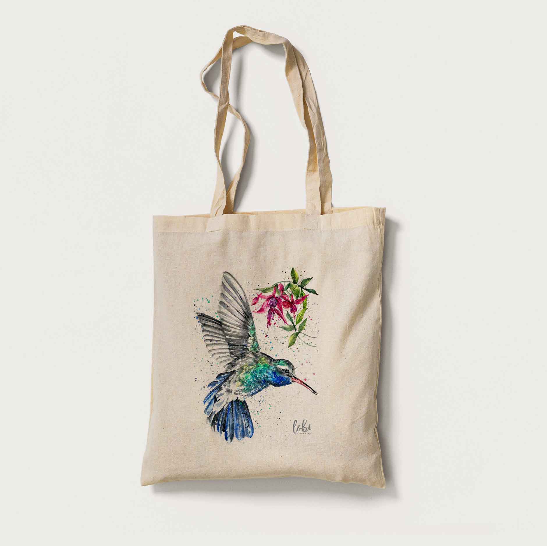 Natural Cotton Tote Bag featuring our original watercolour Hummingbird design.